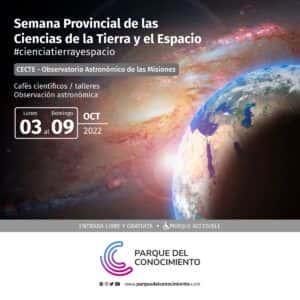 En 2019 la Cámara de Representantes de la provincia instituyó que cada año, del 4 al 10 de octubre, se celebra la “Semana Provincial de las Ciencias de la Tierra y el Espacio”, con el objetivo de generar acciones de enseñanza, divulgación y promoción de temas científicos relacionados al vasto campo de la astronomía y las ciencias de la tierra. Por tal motivo el Centro Educativo en Ciencias de la Tierra y el Espacio (CECTE) organizó diferentes propuestas, entre las que se encuentra la visita del Ingeniero y youtuber Damián Pedraza, “El traductor de Ingeniería” y observaciones astronómicas, que se realizarán durante todas las noches a partir de las 21 hs. en el predio lindero al Centro Educativo en Ciencias de la Tierra y el Espacio (CECTE). Se aclara que esta actividad está sujeta a las condiciones climáticas.