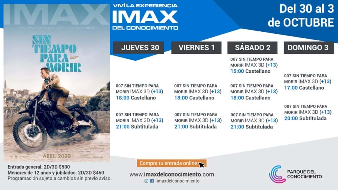 Con Daniel Craig como protagonista, el IMAX del Conocimiento presenta este jueves un nuevo estreno de acción, aventuras y suspenso. “Sin tiempo para morir” es la nueva entrega del Agente 007, que cuenta con un elenco estelar y está dirigida por Cary Fukunaga (Jane Eyre y True Detective). Las entradas están a la venta en [imaxdelconocimiento.com](http://imaxdelconocimiento.com)