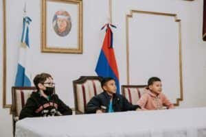 En el marco de la recorrida por la Casa de Gobierno, los estudiantes caminaron el patio y visitaron la Sala de Situación donde se reúne el Gobernador con su Gabinete de Ministros. También recibieron cada uno un presente conteniendo un rompecabezas para aprender de historia y una bandeja con alimentos saludables.