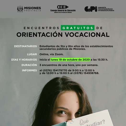 El Gabinete Psicopedagógico Interdisciplinario del Consejo General de Educación Misiones informa que a partir del próximo lunes 19 de octubre se realizarán encuentros gratuitos de orientación vocacional vía zoom destinados a estudiantes de 5to y 6to año.