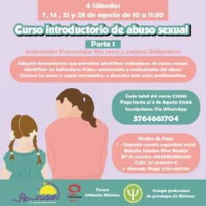 Durante el mes de agosto, se realizarán 4 encuentros vía ZOOM, los días sábados: 7 , 14, 21 y 28 de 10 a 11:30 sobre prevención del abuso sexual.