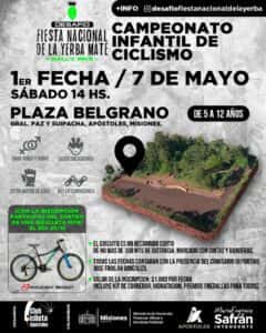 La Dirección de Deportes de la Municipalidad de Apóstoles junto al Club Ciclista informa a la comunidad en general que el próximo sábado 7 de mayo, se realizará en la Plaza Belgrano la primera fecha del Campeonato Infantil de Ciclismo.