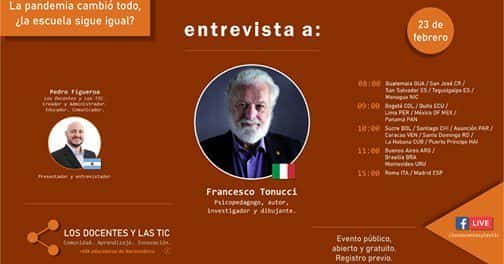 Este Martes 23 de Febrero, desde Argentina, se transmitirá en vivo una entrevista a Francesco Tonucci . Se hablará sobre las necesidades y oportunidades de cambio que se presentan a la escuela hoy.