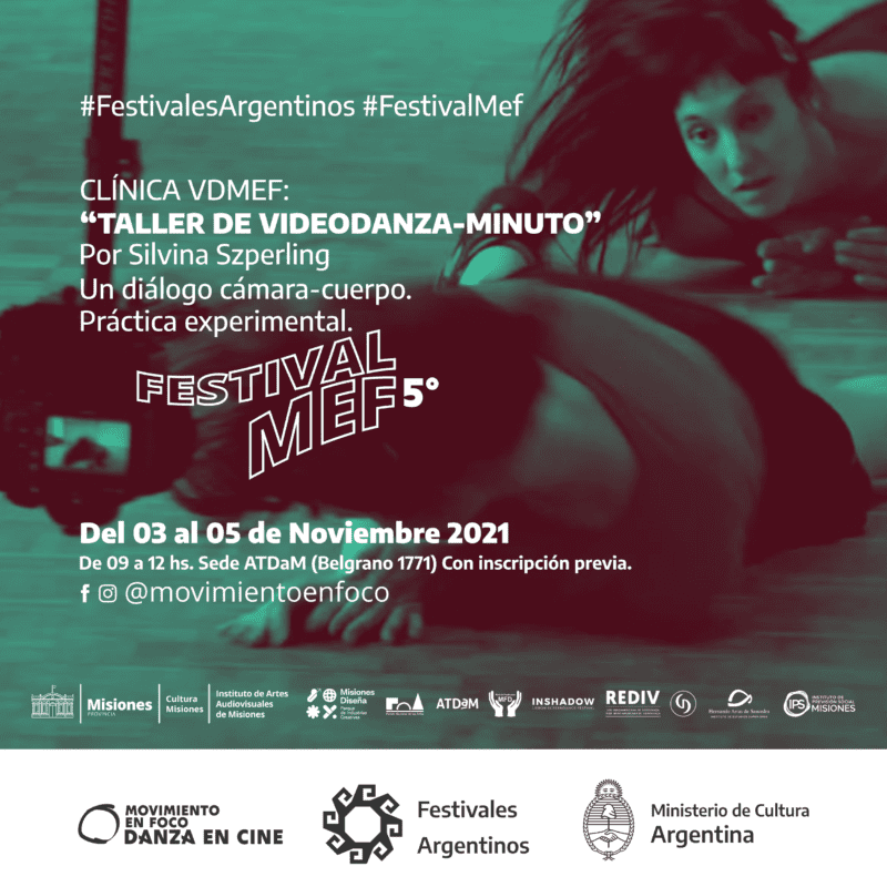 Para esta quinta edición encuadrada dentro de la danza y la tecnología se desarrollarán durante la semana actividades, charlas, talleres y actividades artísticas en espacios no convencionales. Una de las actividades troncales de este festival es el Taller De Videodanza – Minuto a cargo de pionera en nuestro país de la temática, Silvina Szperling.